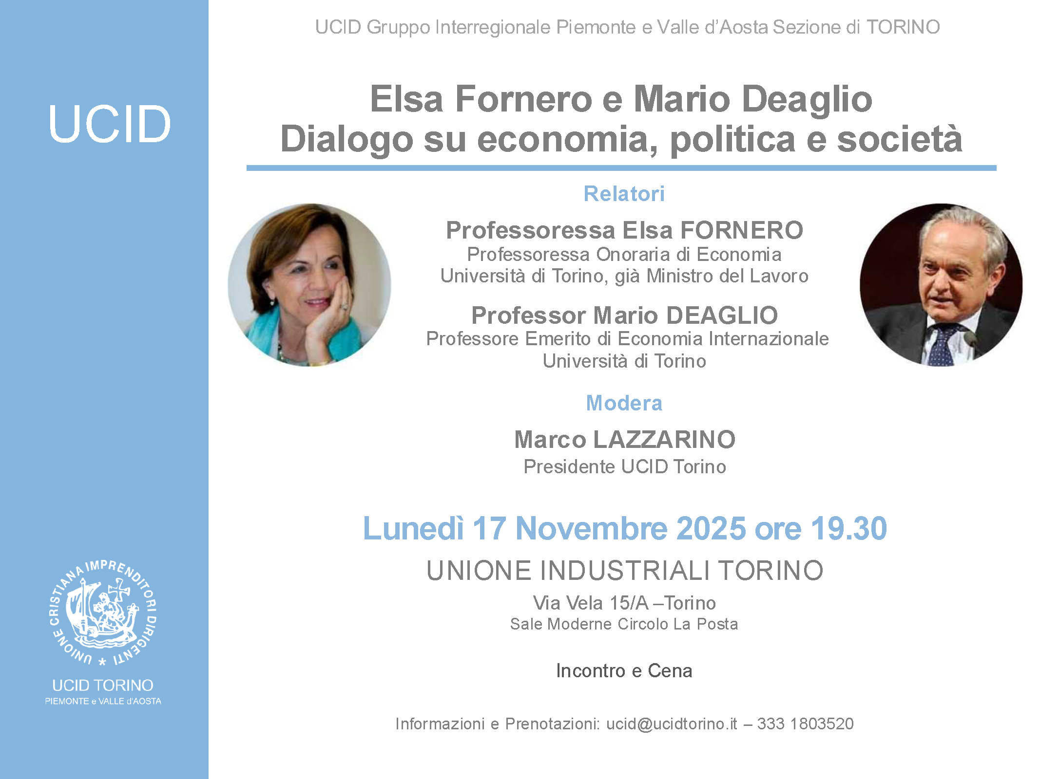 Elsa Fornero e Mario Deaglio.Dialogo su economia, politica e società.Incontro promosso da UCID Torino.17 novembre 2025 ore 19,30