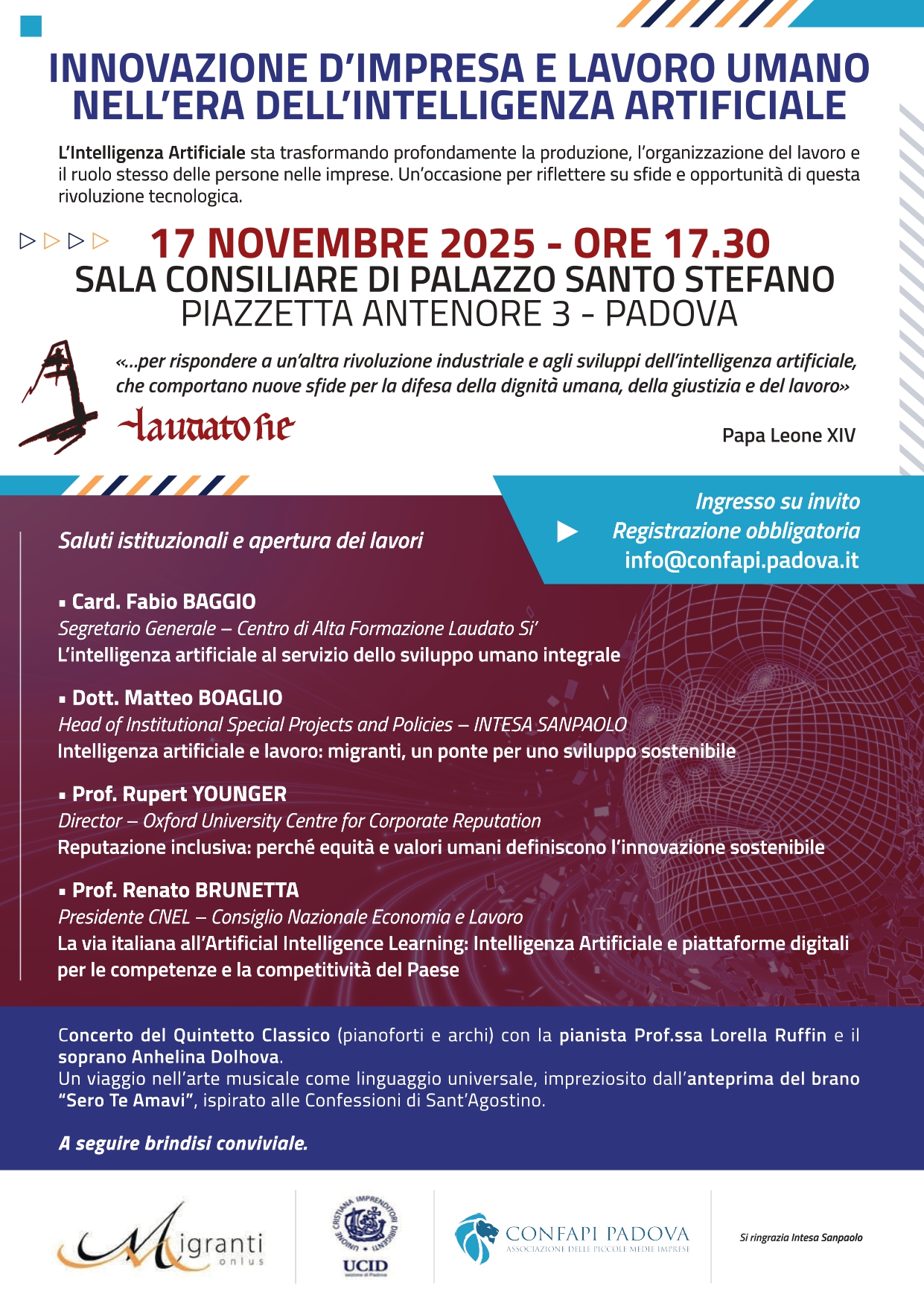 Innovazione d’impresa e lavoro umano nell’era dell’intelligenza artificiale.Incontro promosso da UCID Padova.17 novembre 2025, ore 17,30